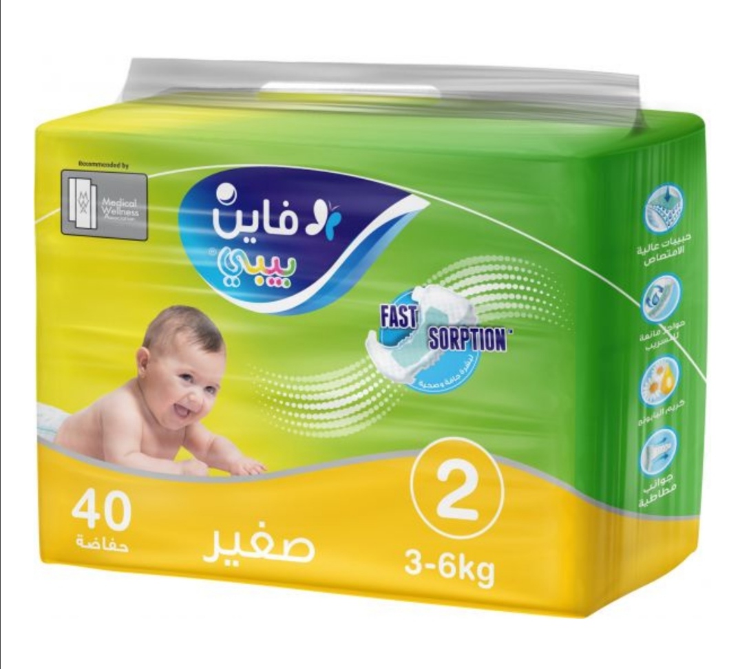 حفاضات فاين بيبي سريعة الامتصاص، مقاس 2، حجم صغير 3-6 كجم، 40 حفاضةE£ 85 FineBaby -