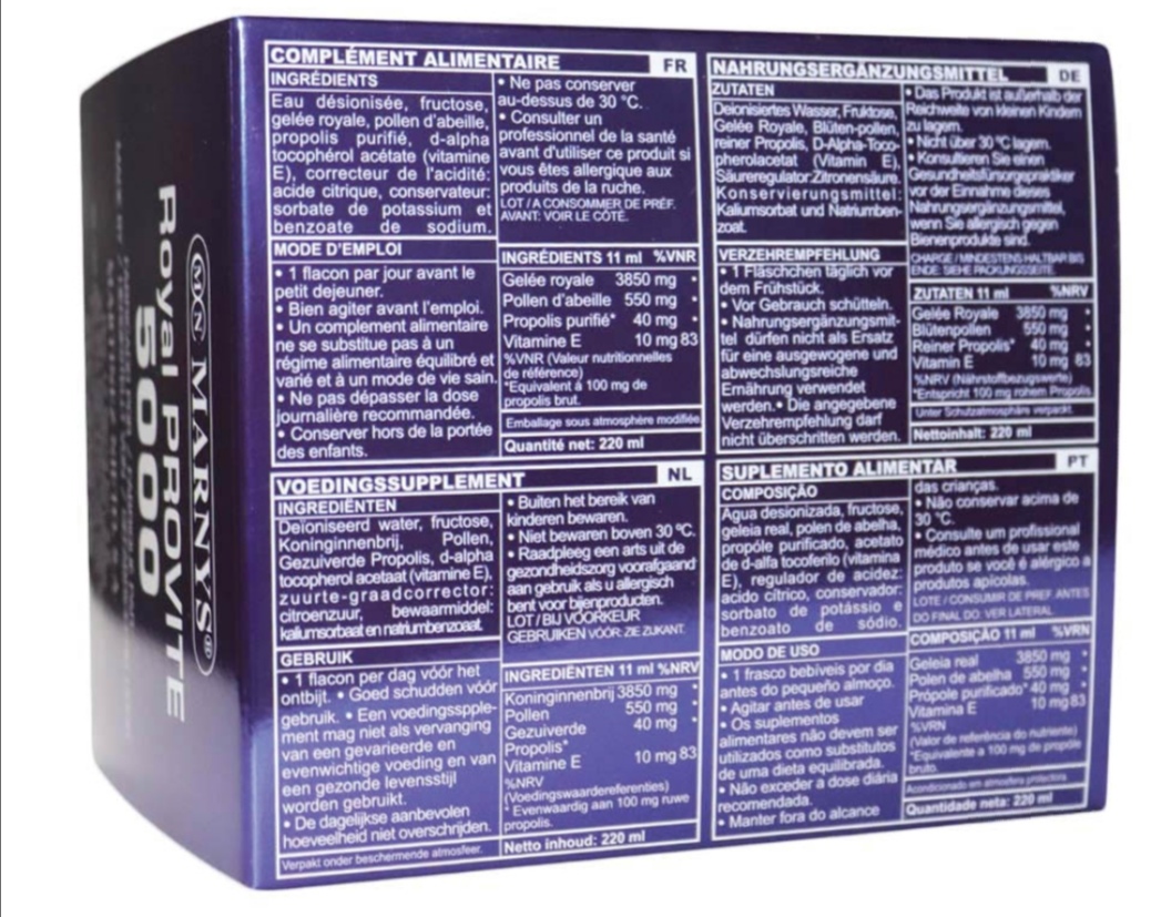 MARNYS® Royal PROVITE 5000. Royal Jelly, Bee Pollen, Propolis and Vitamin E. 20 vials x 11 ml = 220 ml. Food Supplement.
